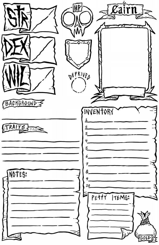 Cairn: Barebones Edition is an adventure game about traversing underground tunnels, decrepit castles, dark forests, and other dreadful places. Character creation is entirely random and fast, exploration is tense and rewarding, and combat is chaotic and lethal.