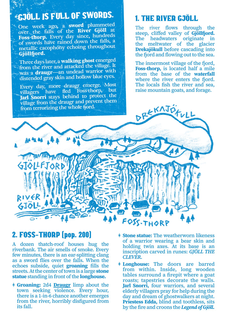 One week ago, a sword plummeted over the falls of the river Gjöll at Foss-thorp. Every day since, hundreds of swords have rained down the falls, their metallic cacophony echoing throughout Gjöllfjord.